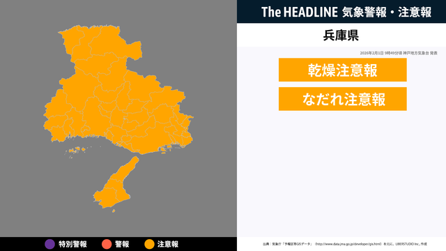 2月1日9時49分頃、兵庫県に乾燥注意報・なだれ注意報が発表