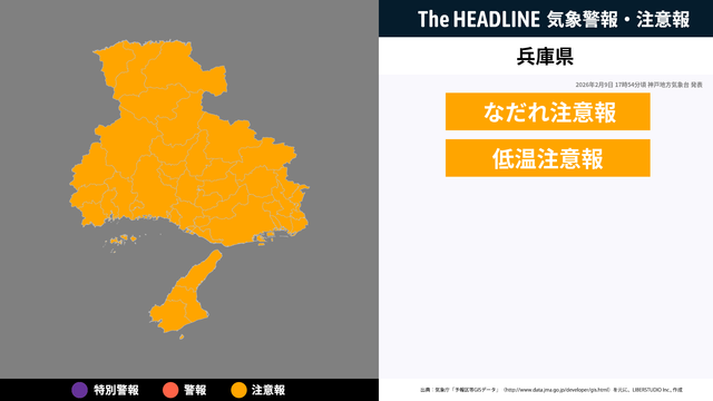 2月9日17時54分頃、兵庫県になだれ注意報・低温注意報が発表
