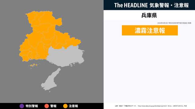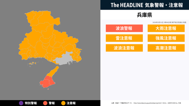 現在、兵庫県に発表されている警報・注意報。お住まいの方は、情報に注意する必要があり、情報の更新を確認することが望ましい。