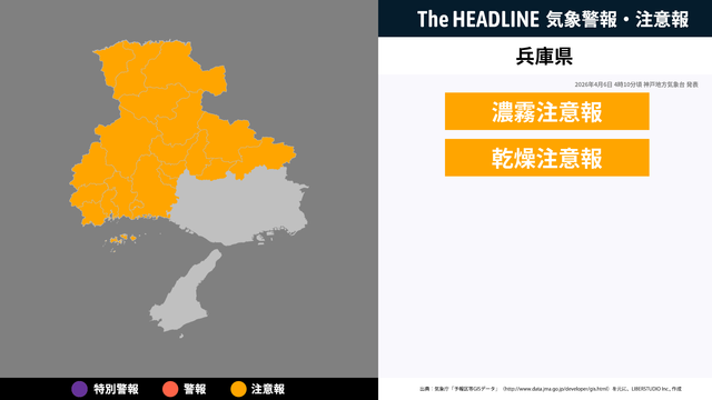 4月6日4時10分頃、兵庫県に濃霧注意報・乾燥注意報が発表