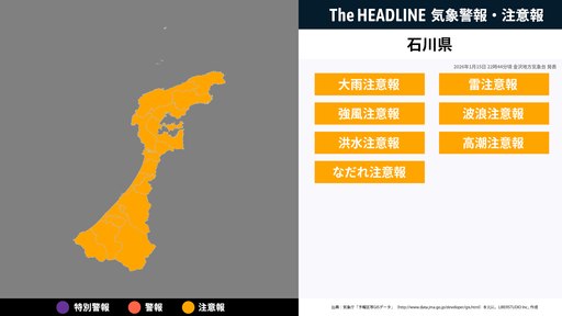 1月15日22時44分頃、石川県の大雨注意報・雷注意報などが更新