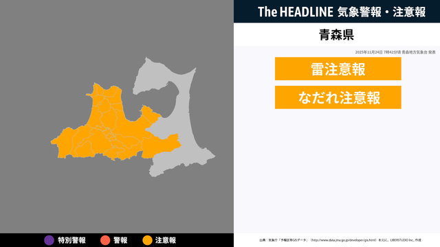 11月24日7時42分頃、青森県に雷注意報・なだれ注意報が発表