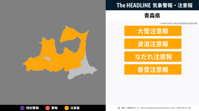 12月4日17時18分頃、青森県の大雪注意報・波浪注意報などが更新