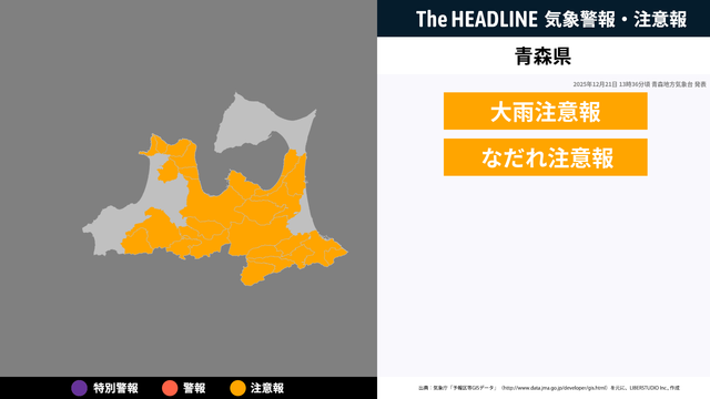 12月21日13時36分頃、青森県に大雨注意報・なだれ注意報が発表