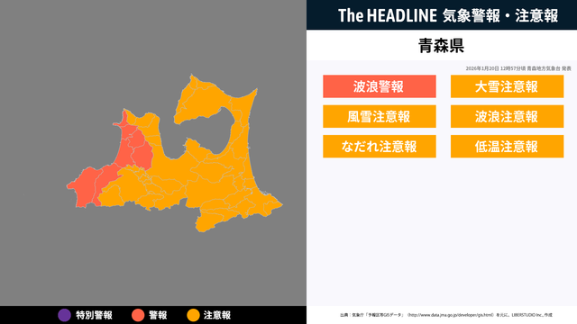 1月20日4時32分頃、青森県の大雪注意報・風雪注意報などが更新
