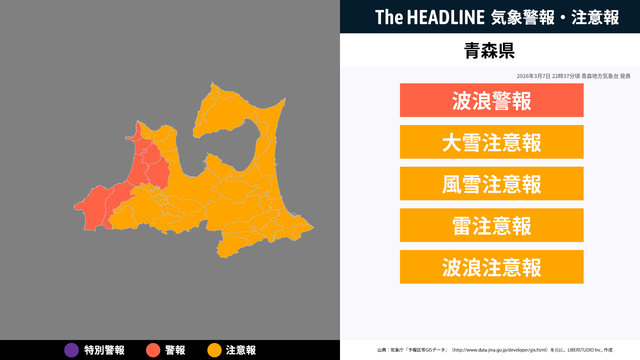 現在、青森県に発表されている警報・注意報。お住まいの方は、情報に注意する必要があり、情報の更新を確認することが望ましい。