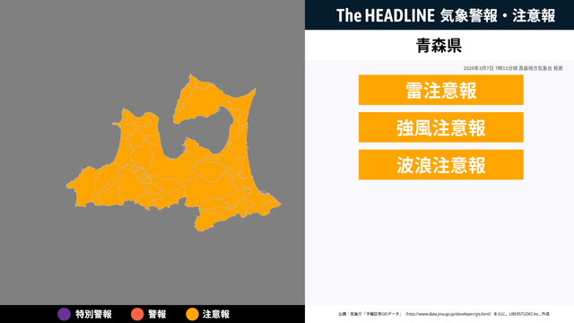 3月7日7時11分、青森地方気象台より青森県に雷注意報・強風注意報などが発表された。