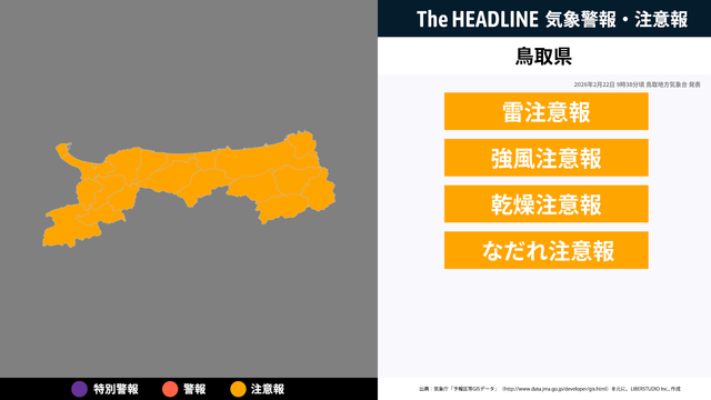 現在、鳥取県に発表されている警報・注意報。お住まいの方は、情報に注意する必要があり、情報の更新を確認することが望ましい。