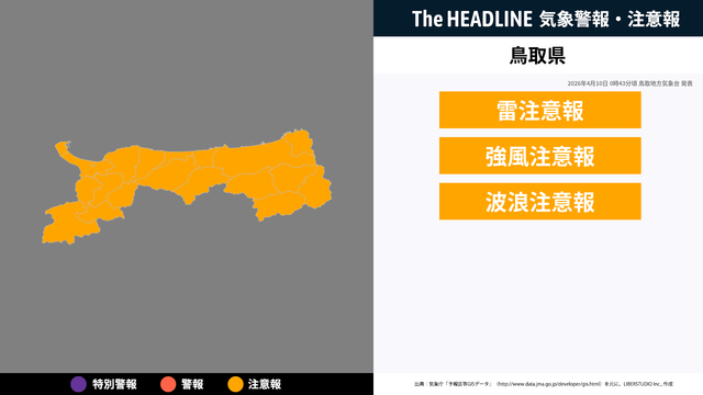 現在、鳥取県に発表されている警報・注意報。お住まいの方は、情報に注意する必要があり、情報の更新を確認することが望ましい。