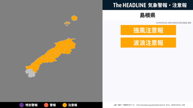 4月10日16時13分頃、島根県に強風注意報・波浪注意報が発表