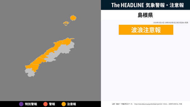 3月13日19時54分頃、島根県に波浪注意報が発表