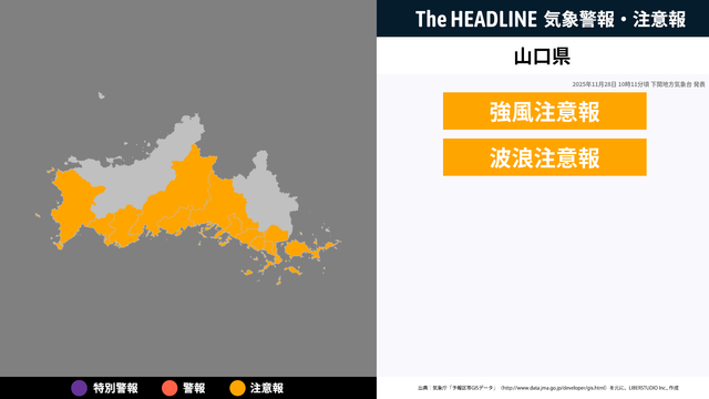 11月28日10時11分頃、山口県の強風注意報・波浪注意報が更新