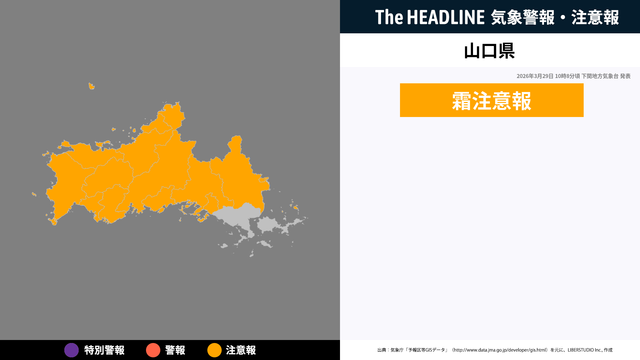 現在、山口県に発表されている警報・注意報。お住まいの方は、情報に注意する必要があり、情報の更新を確認することが望ましい。