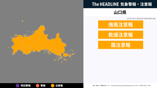 11月7日10時10分、下関地方気象台より山口県に強風注意報・乾燥注意報などが発表された。