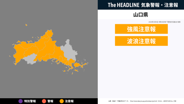 3月4日4時38分頃、山口県の強風注意報・波浪注意報が更新