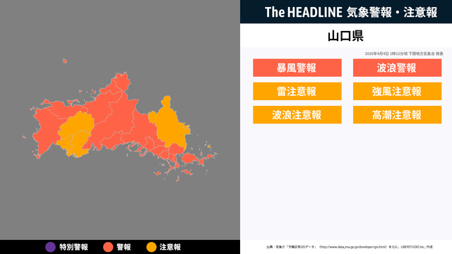 4月4日1時12分、下関地方気象台より山口県に暴風警報・波浪警報などが発表された。対象の市区町村にお住まいの方は、最新の情報を入手しつつ、避難や警戒など適切な行動を取る必要がある。
