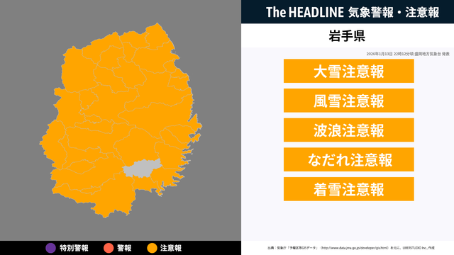 1月13日22時12分頃、岩手県の大雪注意報・風雪注意報などが更新