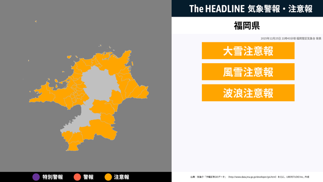 12月25日21時43分頃、福岡県に大雪注意報・風雪注意報などが発表
