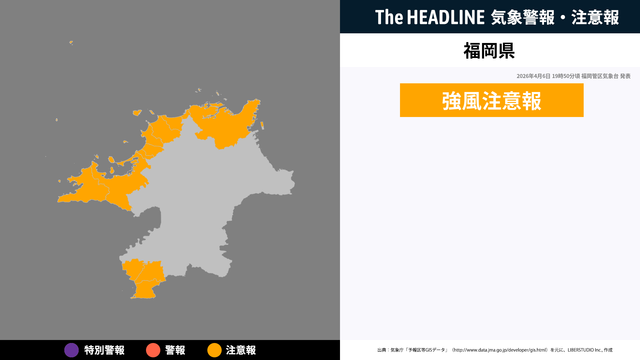 4月6日19時50分頃、福岡県の強風注意報が更新
