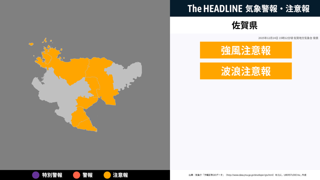 12月14日15時12分頃、佐賀県の強風注意報・波浪注意報が更新