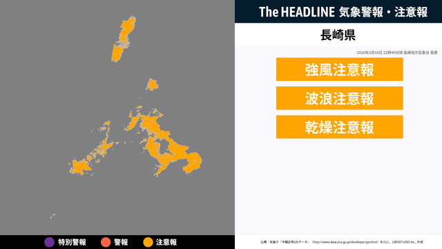 2月18日22時40分頃、長崎県の強風注意報・波浪注意報などが更新