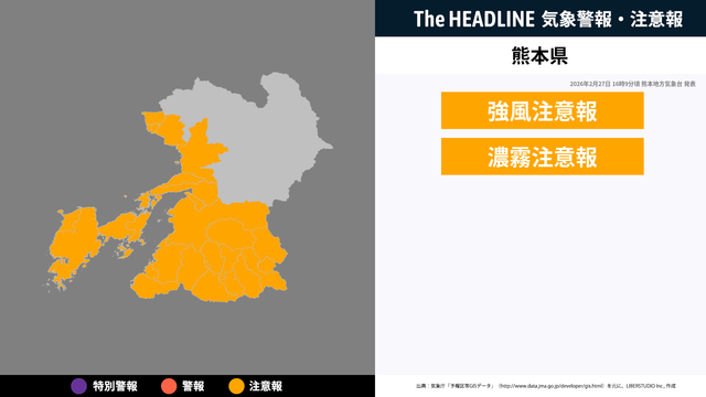 2月27日6時18分頃、熊本県に強風注意報が発表