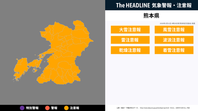 現在、熊本県に発表されている警報・注意報。お住まいの方は、情報に注意する必要があり、情報の更新を確認することが望ましい。