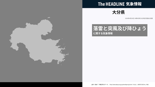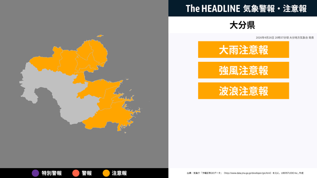 4月26日20時37分、大分地方気象台より大分県に大雨注意報・強風注意報などが発表された。