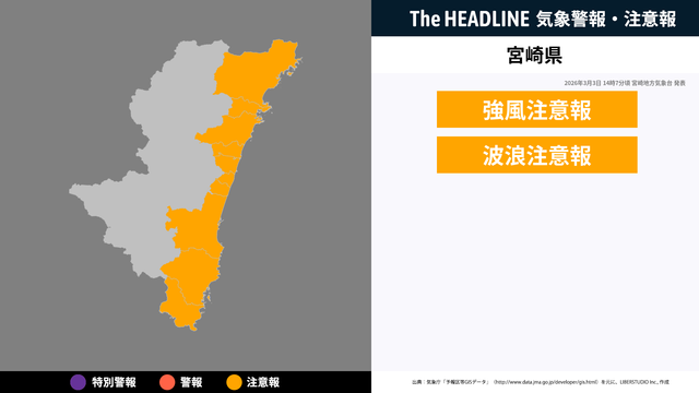 3月3日14時7分頃、宮崎県の強風注意報・波浪注意報が更新