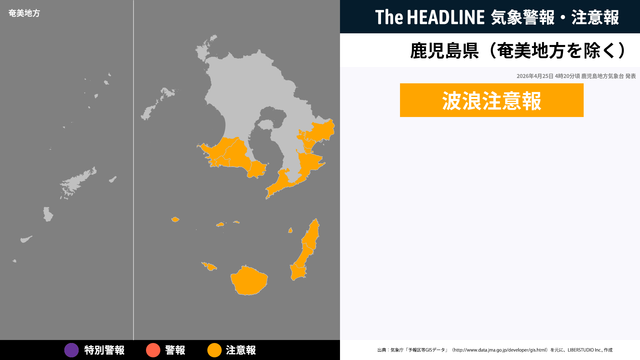 4月11日3時30分頃、鹿児島県(奄美地方除く)の波浪注意報が解除