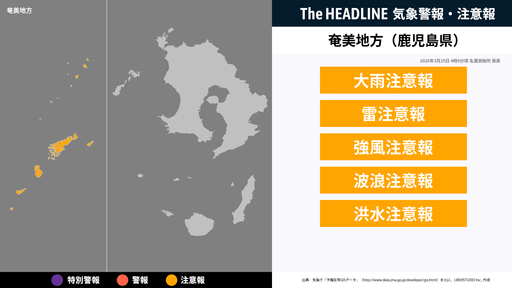 3月25日4時8分頃、奄美地方の大雨注意報・雷注意報などが更新