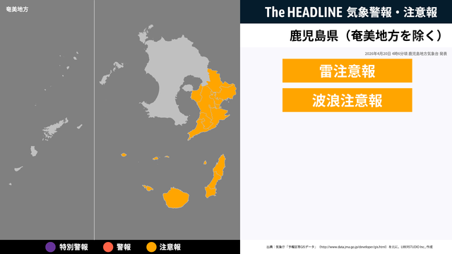 現在、鹿児島県に発表されている警報・注意報。お住まいの方は、情報に注意する必要があり、情報の更新を確認することが望ましい。 鹿児島県では、2つの地域で気象警報・注意報が発表されている。