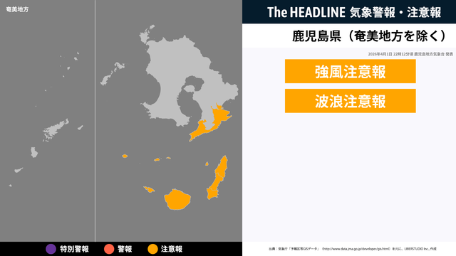 4月1日22時12分、鹿児島地方気象台より鹿児島県(奄美地方除く)に強風注意報・波浪注意報が発表された。