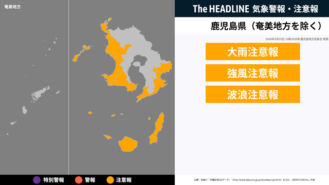 3月25日10時30分、鹿児島地方気象台より鹿児島県(奄美地方除く)に大雨注意報・強風注意報などが発表された。