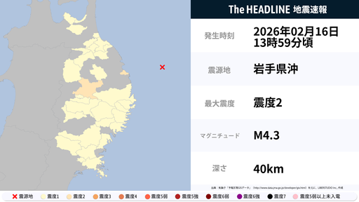 2月16日14時0分頃、岩手県で最大震度2の地震を観測