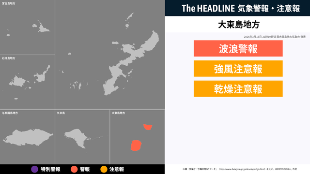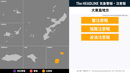 3月12日19時32分頃、大東島地方の雷注意報・強風注意報などが更新