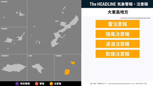 3月12日16時7分頃、大東島地方に雷注意報・強風注意報などが発表