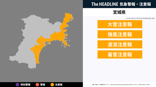 12月14日7時32分頃、宮城県に大雪注意報・強風注意報などが発表