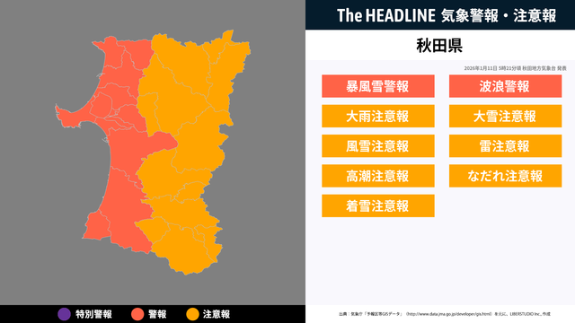 1月11日5時21分、秋田地方気象台より秋田県に暴風雪警報・波浪警報などが発表された。対象の市区町村にお住まいの方は、最新の情報を入手しつつ、避難や警戒など適切な行動を取る必要がある。