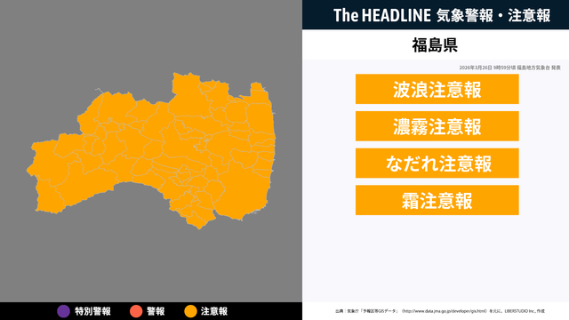 3月27日6時9分頃、福島県の波浪注意報・濃霧注意報などが更新