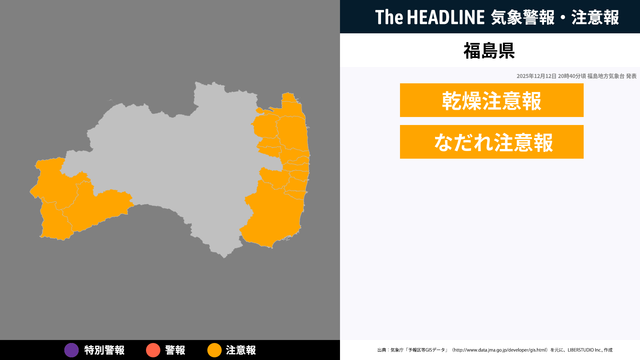 12月12日20時40分、福島地方気象台より福島県に乾燥注意報・なだれ注意報が発表された。