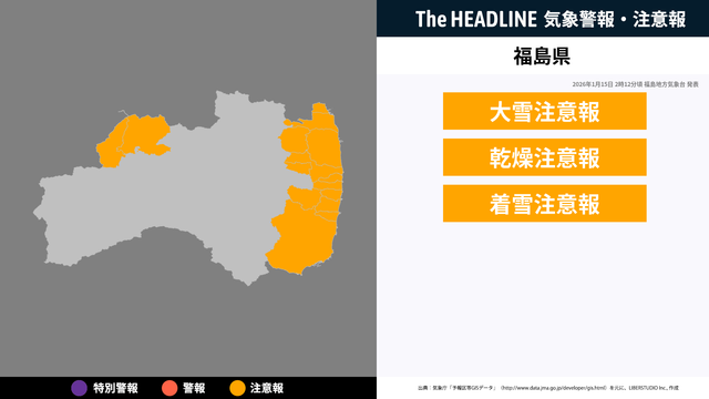 1月15日2時12分、福島地方気象台より福島県に大雪注意報・乾燥注意報などが発表された。