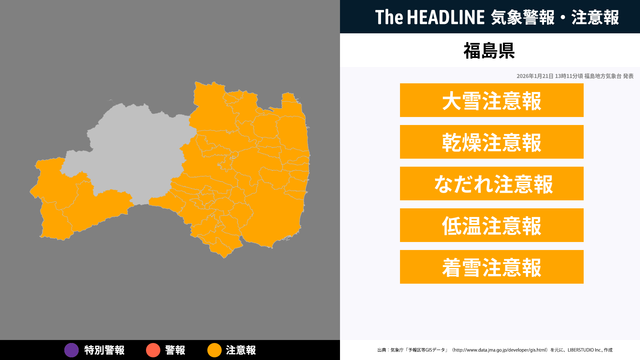 1月21日16時11分頃、福島県の大雪注意報・乾燥注意報などが更新