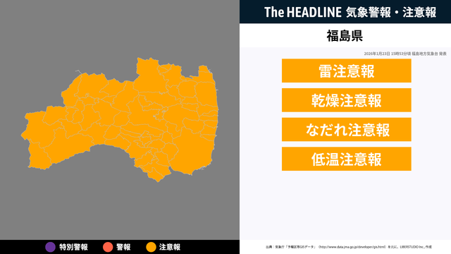1月23日15時53分、福島地方気象台より福島県に雷注意報・乾燥注意報などが発表された。