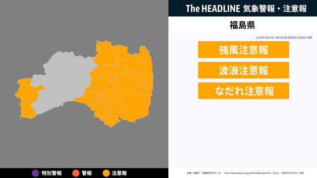 4月10日1時32分頃、福島県に強風注意報・波浪注意報などが発表