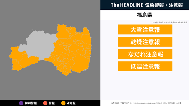 1月29日11時30分、福島地方気象台より福島県に大雪注意報・乾燥注意報などが発表された。