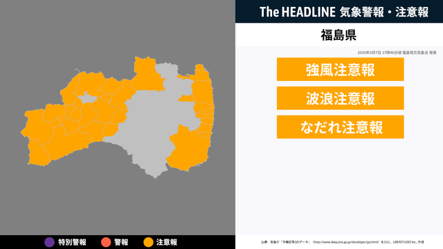 3月7日17時46分頃、福島県の強風注意報・波浪注意報などが更新