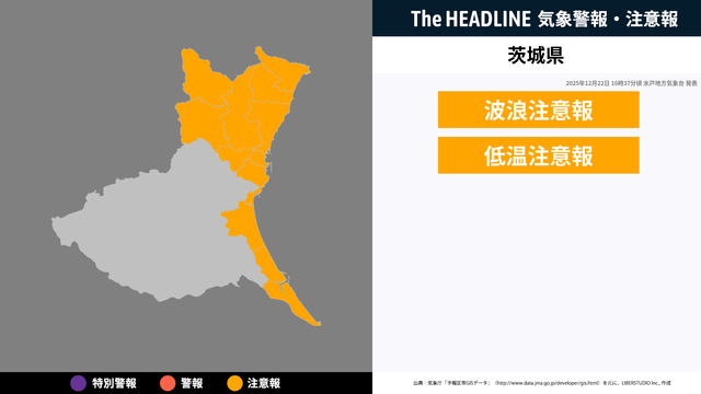 12月22日16時37分頃、茨城県に波浪注意報・低温注意報が発表