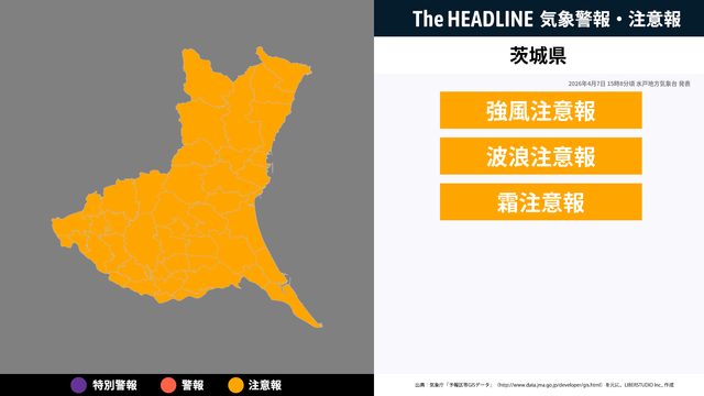 4月7日15時8分頃、茨城県の強風注意報・波浪注意報などが更新