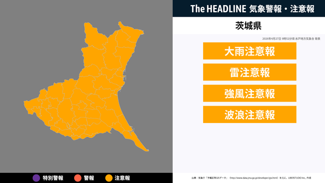現在、茨城県に発表されている警報・注意報。お住まいの方は、情報に注意する必要があり、情報の更新を確認することが望ましい。
